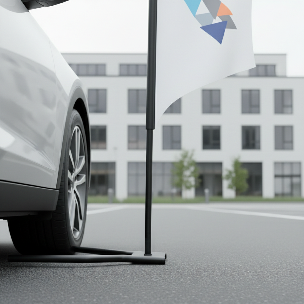 Speziell für den Einsatz bei Autohäusern oder Veranstaltungen, bei denen Fahrzeuge beworben werden, ermöglicht dieser Ausleger die Fixierung der Beachflag unter Autoreifen.