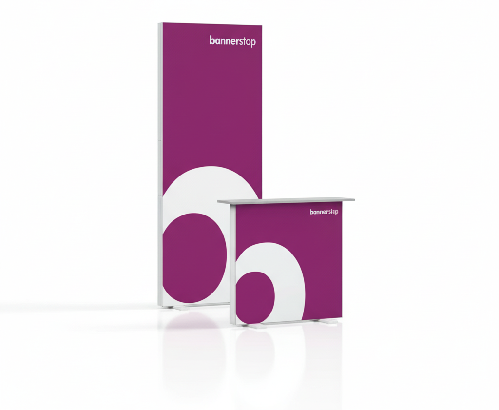 Der LED Messestand 1 x 1 vereint einen beidseitig beleuchteten Textilspannrahmen (100 × 250 cm) mit einer LED-Messetheke (100 × 100 cm) zu einem kompakten Messeset. Damit erhalten Sie einen vollständigen Promotionbereich, der ohne aufwändige Standbauten auskommt. Das Set eignet sich besonders für Unternehmen, die auf Messen, bei Produktpräsentationen oder Firmenevents professionell auftreten möchten – ohne lange Vorbereitungszeiten.