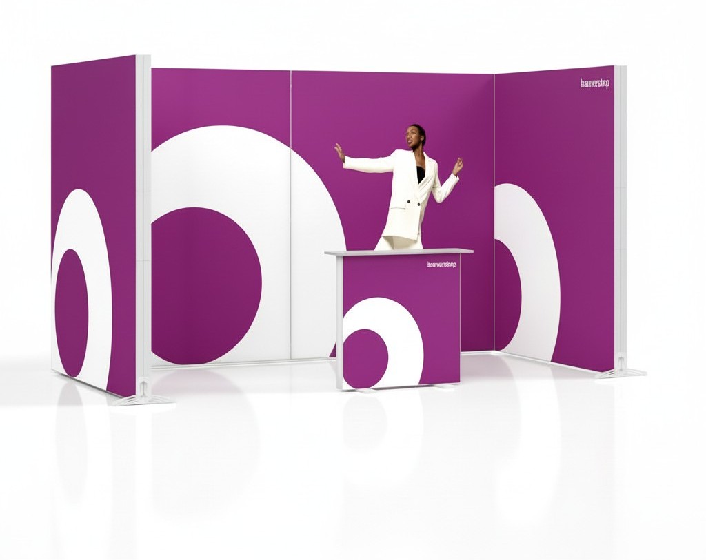 Auf Messen und Ausstellungen macht die beidseitige LED-Kantenbeleuchtung Ihre Marke über die gesamte U-Konstruktion sichtbar – auch in belebten Hallen. Die vier beleuchteten Wände erzeugen aus nahezu jedem Blickwinkel Aufmerksamkeit. Bei Promotionveranstaltungen in Einkaufszentren oder Galerien schafft das großflächig beleuchtete Set eine eindrucksvolle Markenpräsenz. Für Konferenzen eignet sich die Kombination aus Leuchtrahmen und Theke als Registrierungsstand oder Redner-Hintergrund. Auch im eigenen Unternehmen lässt sich der Messestand einsetzen – etwa im Empfangsbereich oder bei internen Veranstaltungen.
