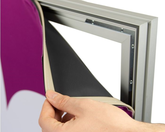 Der Aufbau des Textilspannrahmen Premium erfolgt mittels eines Innensechskanntschlüssel. Dieser ist im Lieferumfang enthalten. Nach dem Zusammenstecken der Rahmenelemente ziehen Sie die mit Keder versehene Textilgrafik einfach in die umlaufende Nut ein. Die elastische Spannung sorgt automatisch für eine perfekt glatte Oberfläche. Bei Bedarf entnehmen Sie die Grafik ebenso schnell wieder und ersetzen sie durch ein neues Motiv. Dies ist besonders bei wechselnden Kampagnen von Vorteil.